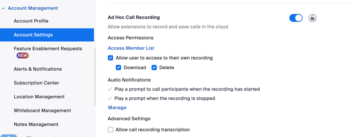 - Search for "Ad Hoc Call Recording" and "Allow user to access to their own recording". Ensure Download and Delete are checked.